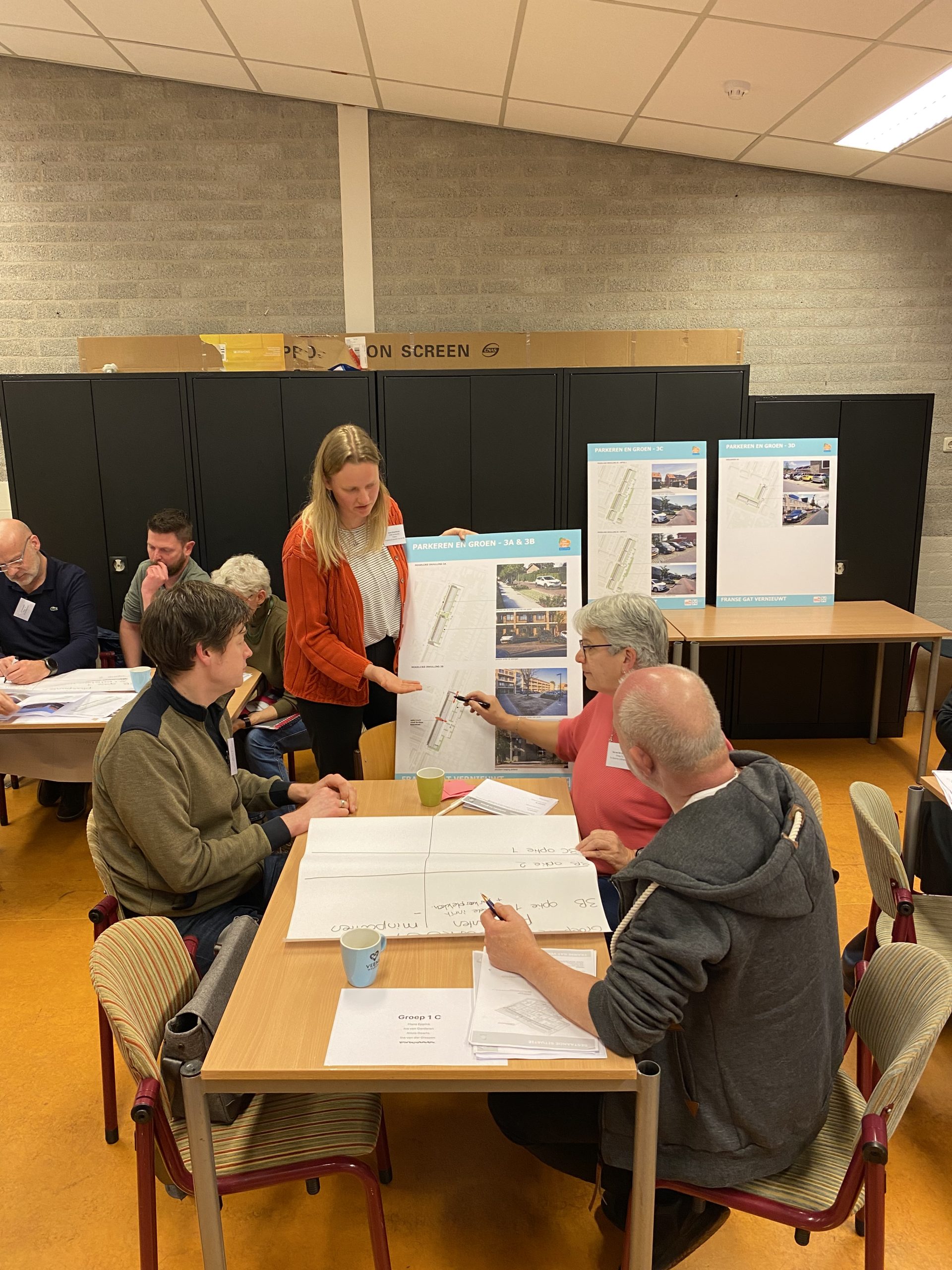 De twee sessies vonden plaats in wijkcentrum Plein Zuid. Beide bijeenkomsten waren inhoudelijk gelijk aan elkaar. Tijdens het werkatelier stonden de thema’s ‘parkeren’, ‘woningbouw’ en het ‘karakter van de wijk’ centraal. Een groep van 41 direct betrokkenen, waaronder huurders, omwonenden en ondernemers, waren hierbij aanwezig. Deelnemers ontvingen voorafgaand aan het werkatelier huiswerk, zodat zij goed voorbereid deel konden nemen aan de sessie. Met het ontwikkelen van dit materiaal is rekening gehouden met de inbreng uit de startbijeenkomsten. Aan de hand van de eerste schetsontwerpen en parkeeroplossingen gingen de deelnemers met elkaar in gesprek. Tijdens de sessies werd er intensief gediscussieerd en dieper ingegaan op wat belangrijk is bij de ontwikkeling van de buurt. In kleine groepjes werden positieve en negatieve punten per onderdeel gepresenteerd. Medewerkers van KAW architecten, gemeente Veenendaal, Veens Welzijn en Veenvesters waren aanwezig om vragen te beantwoorden.